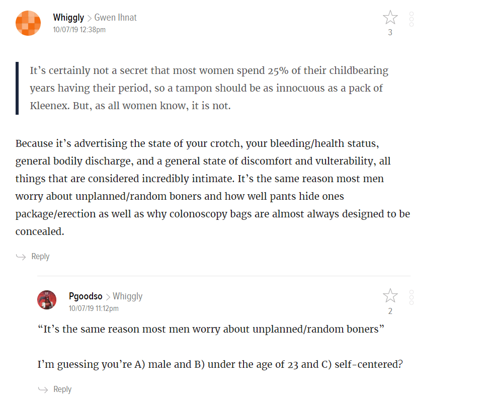Interestingly enough, this skit was unfortunately cut for time, which this socially sensitive topic/taboo – of periods – which could possibly be a factor as to why it was cut to air, even though it was an absolute masterpiece and I laughed way too much at this, especially the part where they introduce what items are used to disguise the tampons. The Tampax Secrets skit creates a discourse about the anxieties women feel displaying to the public that they are on their period. Evelyn Fox Keller “It may be difficult… to understand the enormous reticence with which anyone, especially a woman, would make public his or her personal impressions and experiences, particularly if they reflect negatively on the community. To do so is not only considered unprofessional, it jeopardizes one’s professional image of disinterest and objectivity. Women, who must work so hard to establish that image, are not likely to take such risks. Furthermore, our membership in this community has inculcated in us the strict habit of minimizing any differences due to our sex” (The Anomaly of a Woman in Physics, Evelyn Fox Keller). This skit is definitely an effective way to promote normalization of the availability and use of menstrual products in public. Bonus: And because of users like Whiggly, this is why tampon shame is still a thing: